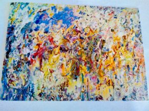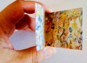 So, this mini-book, My First Book, replicates what I created when I was a youngster. I was moved to make it when I received a postcard announcement of a 2013 exhibition of Larry Poons paintings presented by Danese and Loretta Howard galleries. I thought the reproduced painting was so gorgeous that I wanted to use it as the cover to My First Book: