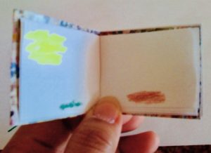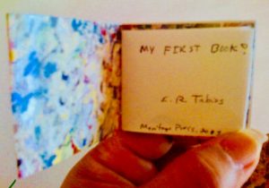 Years later, I would recall my mother’s recollection of my first book. I remembered her tale because I wanted to make—of course!—a book from that memory. I hadn’t yet stumbled across her essay among her papers and so my recollection was based on our oral conversations. From that memory (which was not as detailed as her recounting of it in her paper), I fashioned a tiny book, small enough to fit on my palm. I entitled it—of course!—My First Book. Here is what I wrote about the process of making that book, a book-in-progress process first featured on SitWithMoi, a blog I once maintained about tiny books on tiny chairs: