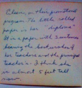 The above faded text reads as: “Eileen, on their promotional program. The little rolled paper is her ‘diploma’. It is a paper with 3 sentences bearing the best wishes of her teachers and the principal. I think she is almost 5 feet tall now.”